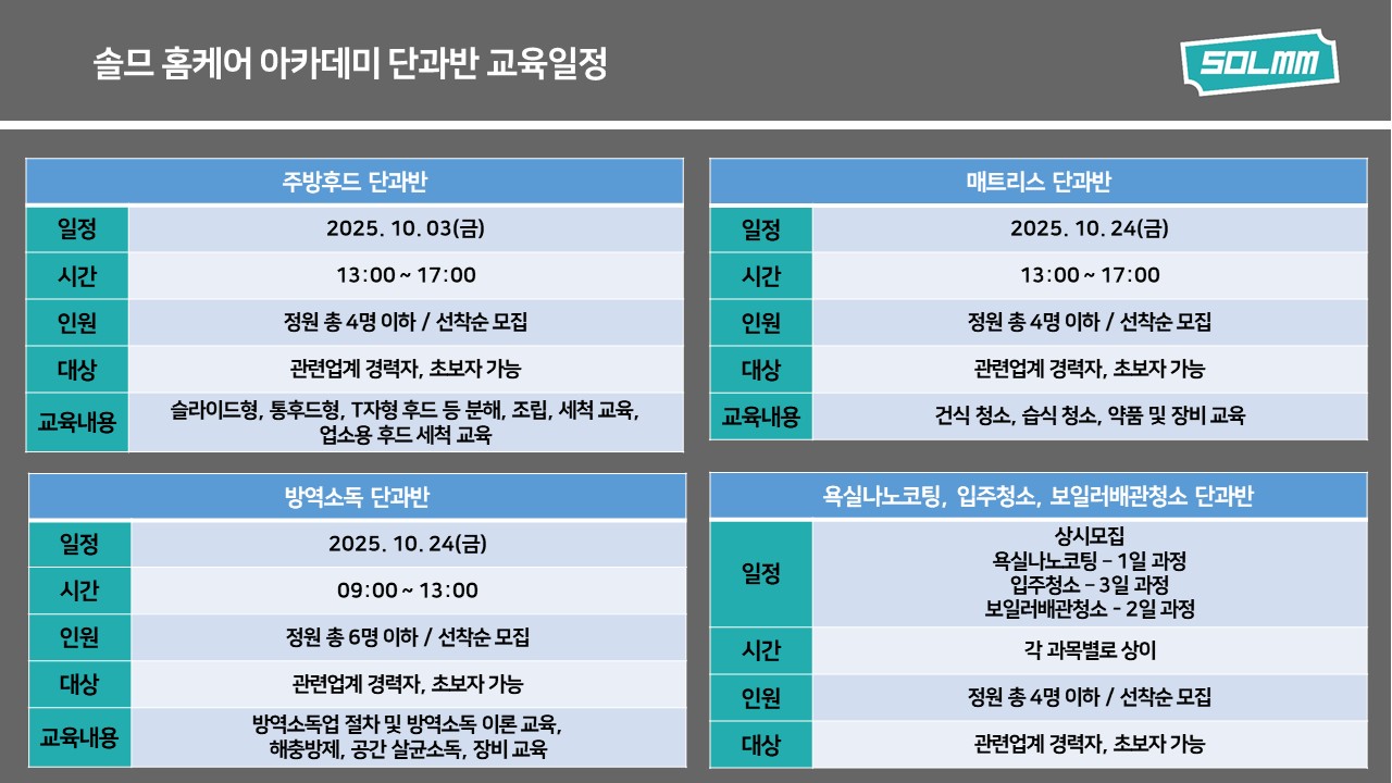이상 10월 에어컨청소 단과반, 세탁기청소 단과반, 주방후드청소 단과반, 보일러배관청소, 방역소독, 입주청소, 욕실나노코팅 교육 일정이었습니다.