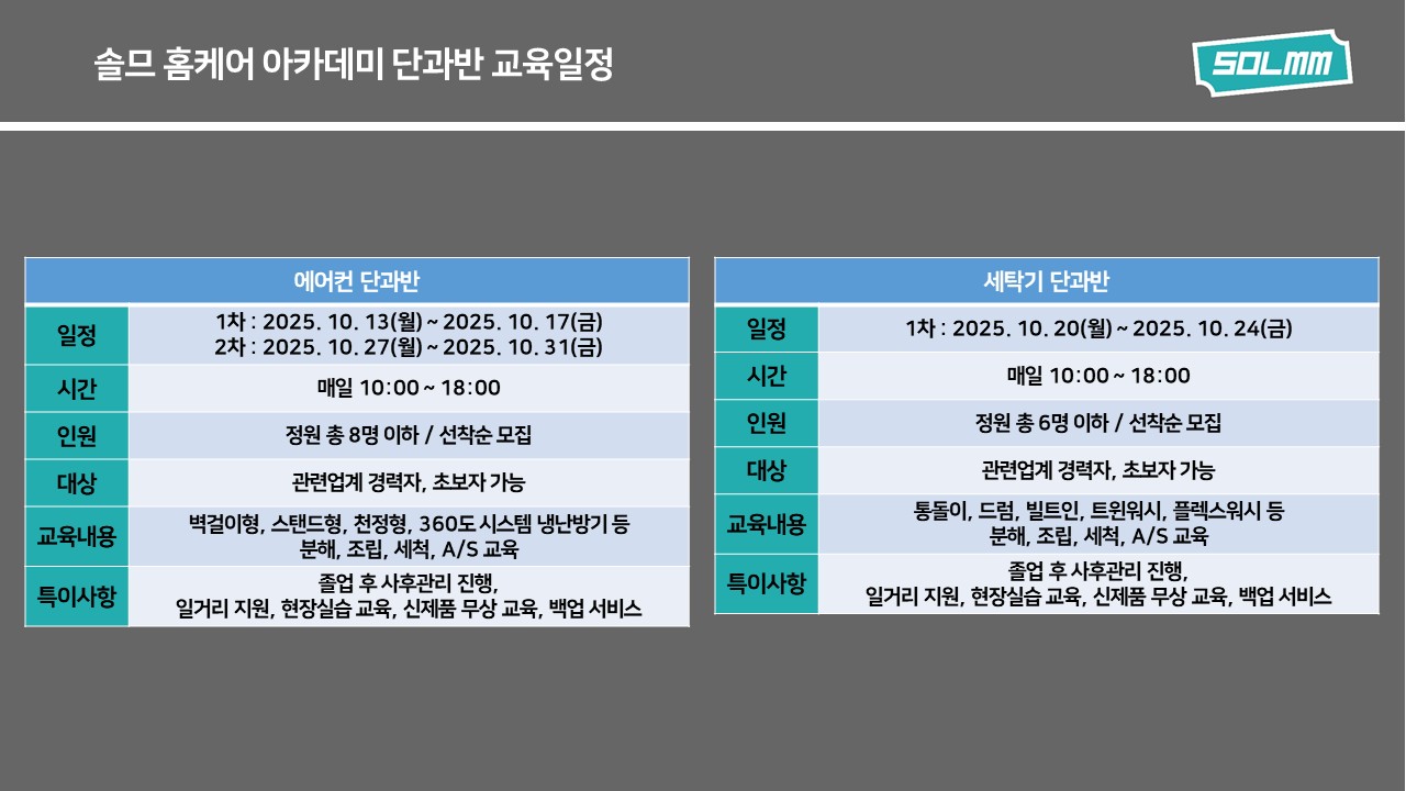 교육내용 : 벽걸이형, 스탠드형, 천정형, 360도 시스템 에어컨 등 분해, 조립, 세척, A/S 교육